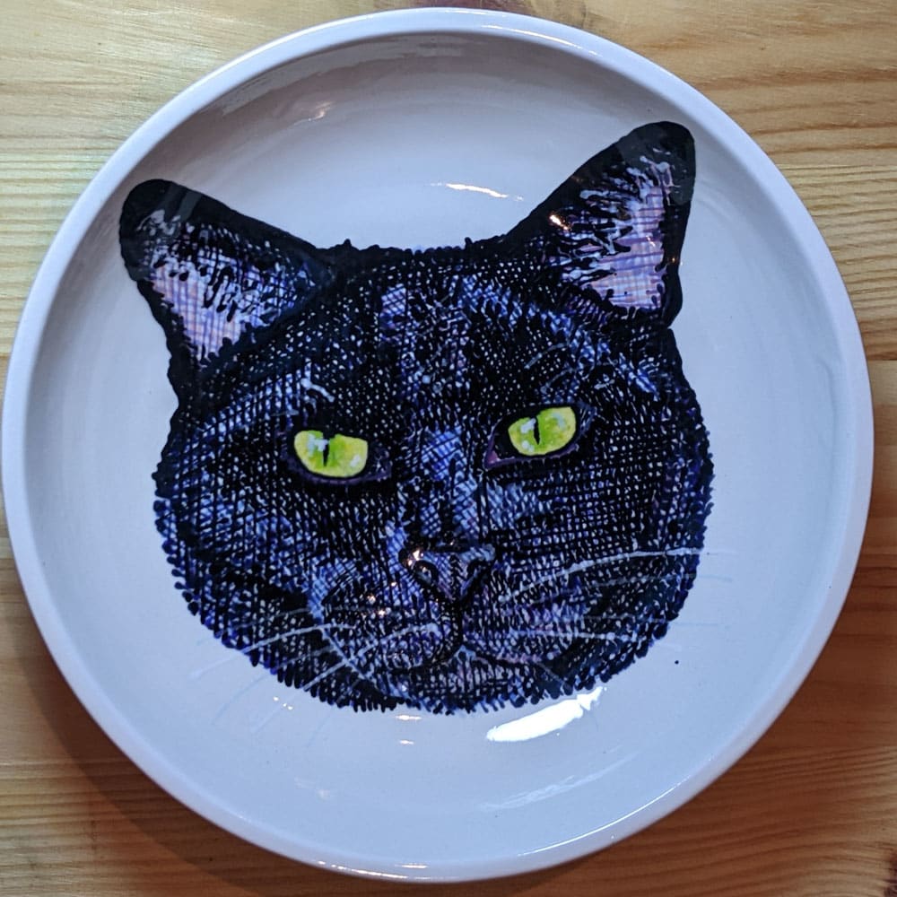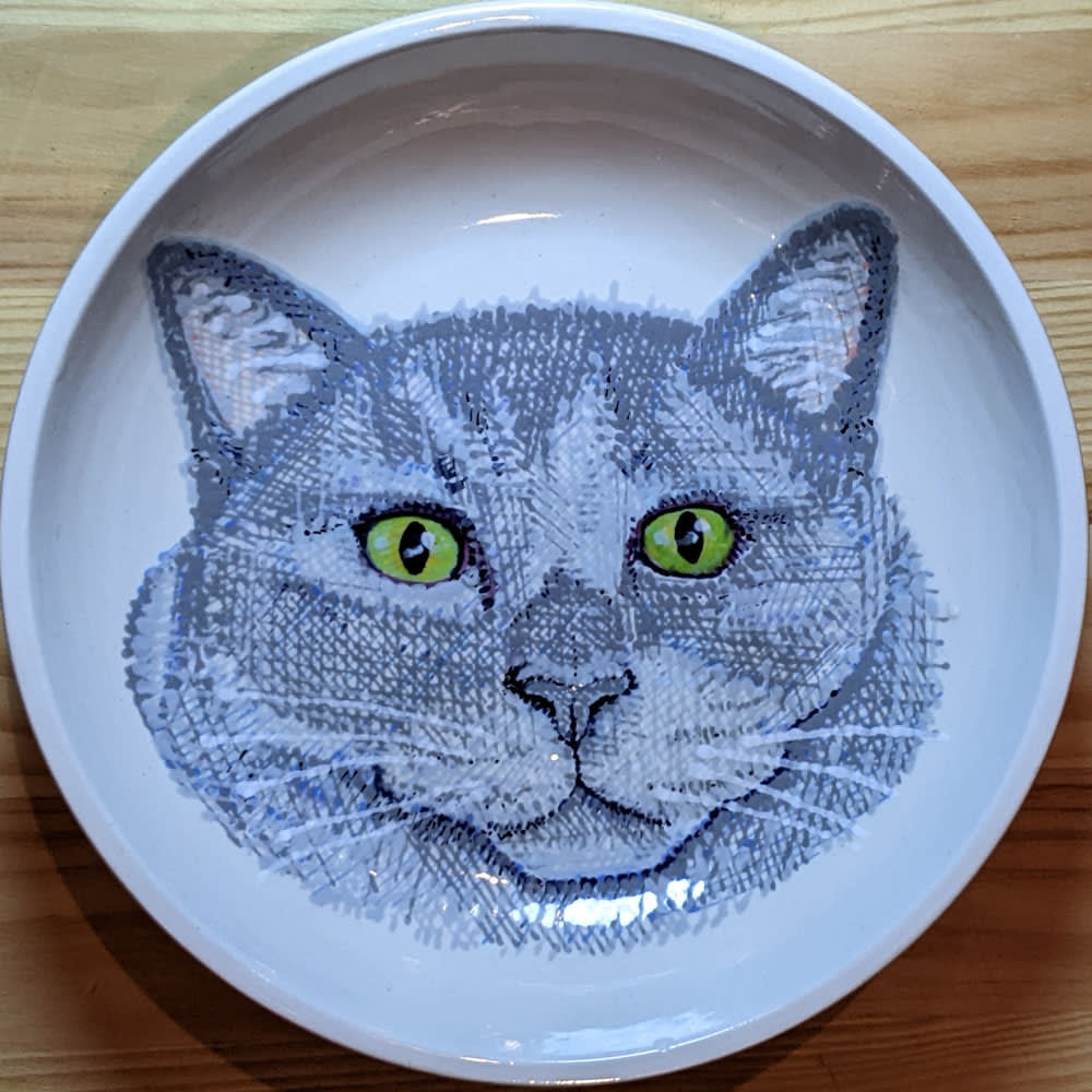 Handcrafted ceramic plate featuring detailed gray cat illustration with green eyes, showcasing intricate pottery design and craftsmanship.